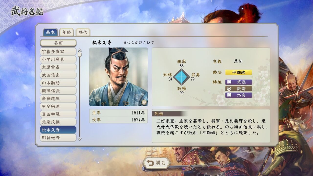 信長の野望は梟雄扱い止めたのに顔は悪人面のままで能力値も高いままだな
