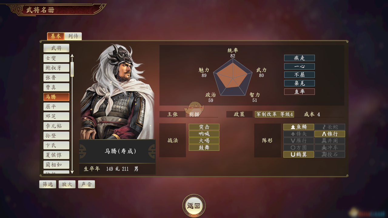 後世の通俗小説『三国志演義』では劉備の五虎大将軍の一人ですが、正史にはその記述はなく、彼が劉備に仕えた期間は短く、地位は驃騎将軍でした。