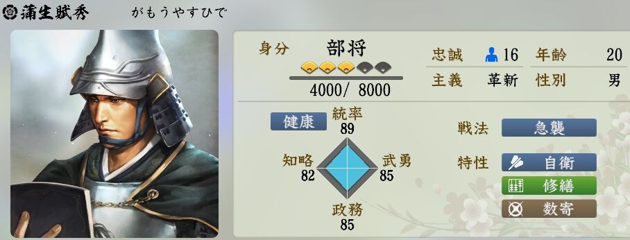 どれも優秀みたいなステータスだけど実際は自分で先陣に突っ込む武力と城下町作り(松坂とか会津若松)の政治が得意な武将って感じやな