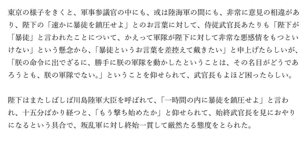 普通は高級軍人こそ徹底的な厳罰を主張して、天皇が助け舟を出す場面だろうにね。